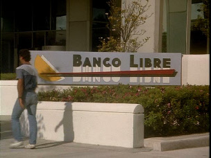 Then it cuts and we see a close up of a bank building with the camera panning down the front. Banco Libre. In reality this was filmed at 4400 Biscayne Blvd., Miami. For some time this was the IVAX building, now it is Opko Heath.