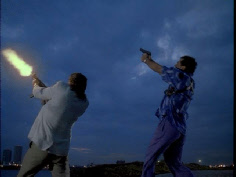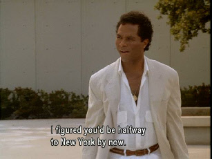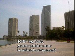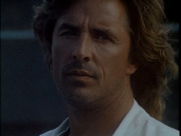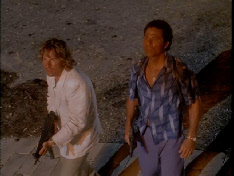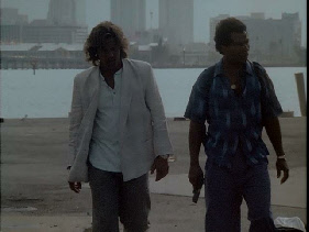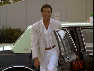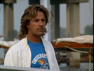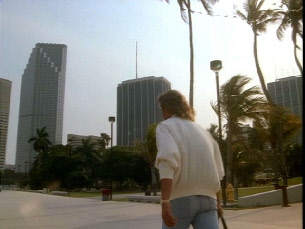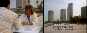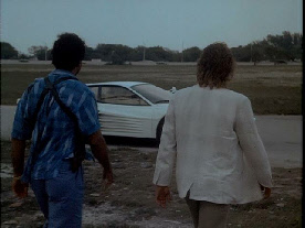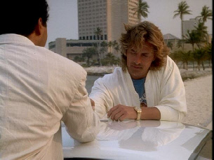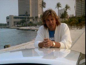 Then he walks up to his stolen car where Tubbs pulls up to meet him. Filmed on location at Bayside.