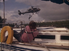 Here, they are attacked again and Crockett shoots down the helicopter with a flare gun. Amazing, also strange that the rotors are not turning and it is a totally different style of helicopter.