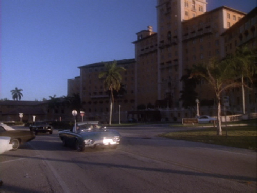 Then we cut to the next day and Castillo is meeting with Crockett and Tubbs. This was also filmed on location at the Biltmore. The same location we saw later used in the Burn Notice episode, No Good Deed.