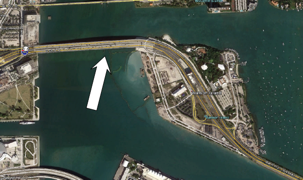 Then it jumps to the east end of the MacArthur Causeway with Belle Isle seen in the background.