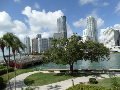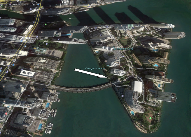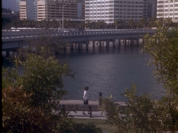 Then we cut to Brickell Key for a meet. The camera is on Brickell Key facing west toward the mainland. We see the van also headed westbound on the Brickell Key Bridge. The Four Ambassadors made famous in the movie Tony Rome are seen in the background.
