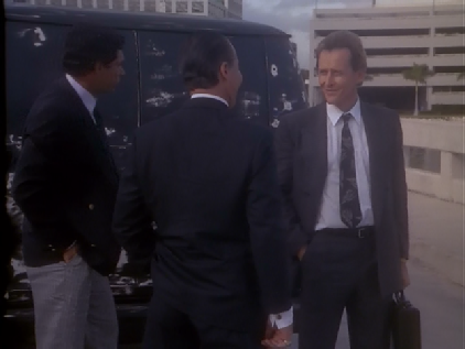 Then we see Boyle meet Enriquez in a parking garage, lower level. This was likely filmed at the Greenberg Traurig Building at 1221 Brickell Ave. but this has not been confirmed.