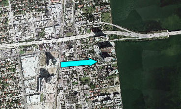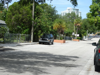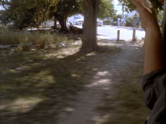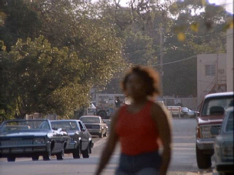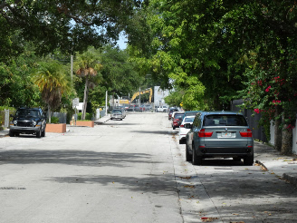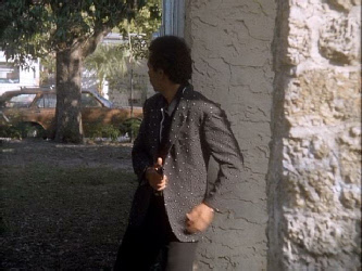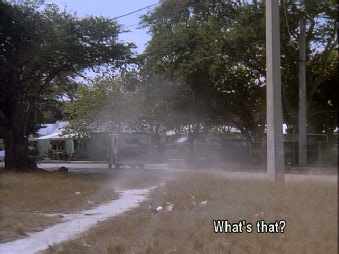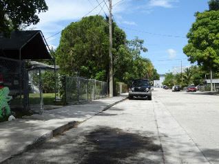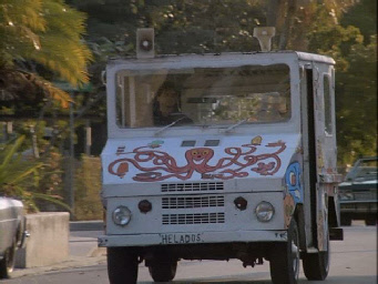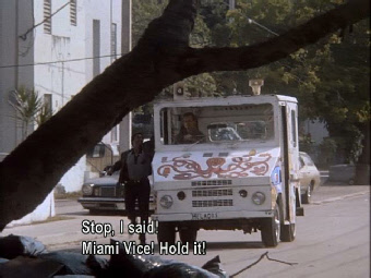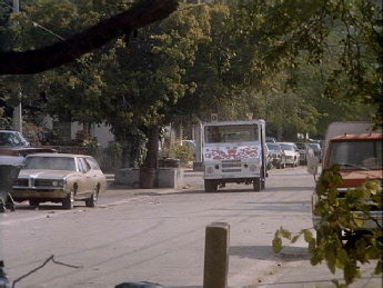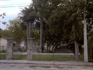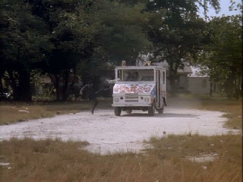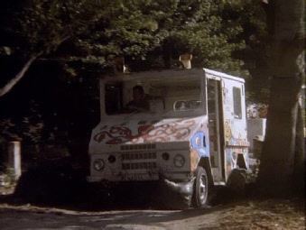 Then we see a view down the street of an approaching ice cream truck. This too was filmed on location in the same area. The camera is looking eastbound down William Avenue with a strong zoom. The truck is seen going from southbound on William Avenue to westbound on William Avenue where the Avenue so curves behind the the Coconut Grove Playhouse. A location that has since been used in Burn Notice, episode 86, Shock Wave.