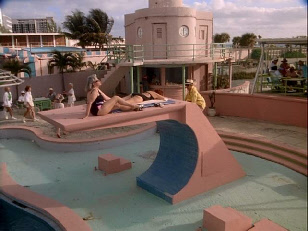 Then we go inside. Filmed on location at the China Club, 1450 Collins Avenue, Miami Beach. This location has been used in numerous Miami Vice episodes: Made For Each Other, Little Miss Dangerous, Walk Alone, Streetwise, Red Tape, The rising Sun of Death, Rock and a Hard Place, and A Bullet For Crockett. I first saw it used in the movie, A Hole In The Head.