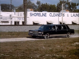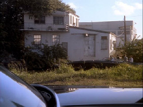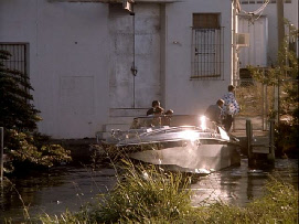 We see them watch from the limo as a go fast boat pulls up in the Little River Canal to the rear of a warehouse. Filmed on location at 471 NE 79th Street, Miami. This is part of the Ted Vernon Specialty Autos complex that we have now seen used in Burn Notice episodes; 38 A Dark Road and 59 Brotherly Love.