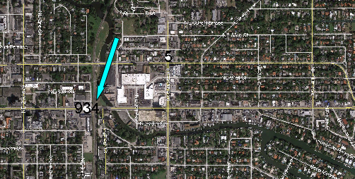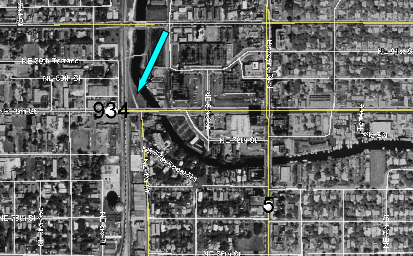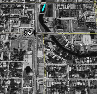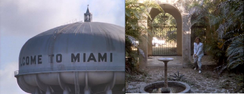 Then we see C+T meet with Lt. Castillo. This was filmed on location in the same area. On A small footbridge that crosses the Little River Canal at the east end of NE 80th Terrace connecting that area to the shopping center on the east side of the canal. Sometime between February 1999 and December 2001 the water tower seen here was torn down.