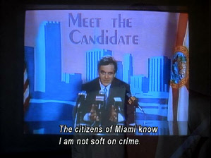 Then we see Crockett on the St. Vitus Dance watching television. He sees Highsmith campaigning on the T.V. Both were likely filmed on studio sets but locations unconfirmed. The episode ends here.