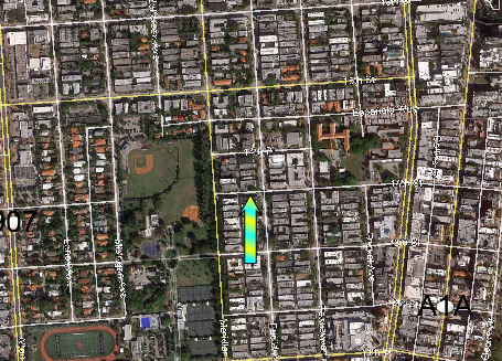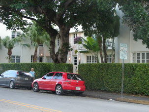 Then we cut to the arms deal. This was filmed on location at 701 14th Street, Miami Beach. The arms deal occurred inside apartment 3. Crockett and Stevens are parked on the east side of Euclid Avenue just feet south of 14th Street. Tubbs pulls up on 14th Street parking opposite 701 14th Street apt. 3 (at the time numbered 705). We saw this location used previously in episode 85, Hell Hath No Furry.