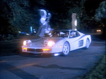 Then we cut to the interior of the car where they are asked, in or out. Not much is seen outside the car so identifying the location is tough but we do see them run a stop sign. No worry though as we can see a motorcycle cop there blocking the intersection for the filming.
